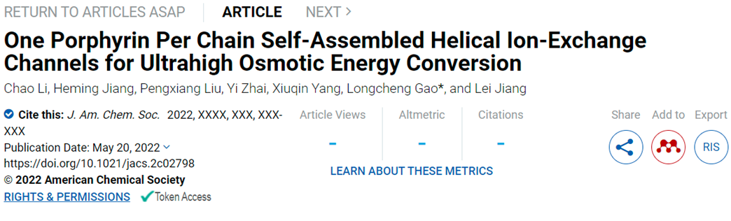 2022年5月20日,Journal of the American Chemical Society 在线发表了koko体育江雷院士、高龙成副教授团队在高效离子交换膜方面的最新研究成果:“One Porphyrin Per Chain Self-Assembled Helical Ion-Exchange Channels for Ultrahigh Osmotic Energy Conversion”。koko体育官网博士生李超为第一作者,高龙成副教授为通讯作者,koko体育官网为第一单位。