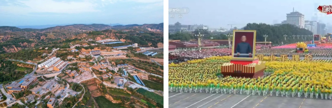 左图:今天的阳坡村村委和民居焕然一新,成为吕梁市“美丽宜居示范村”“乡村振兴示范村” 右图:在庆祝中华人民共和国成立70周年大会上,北航学子组成的 “关键抉择”方阵通过天安门