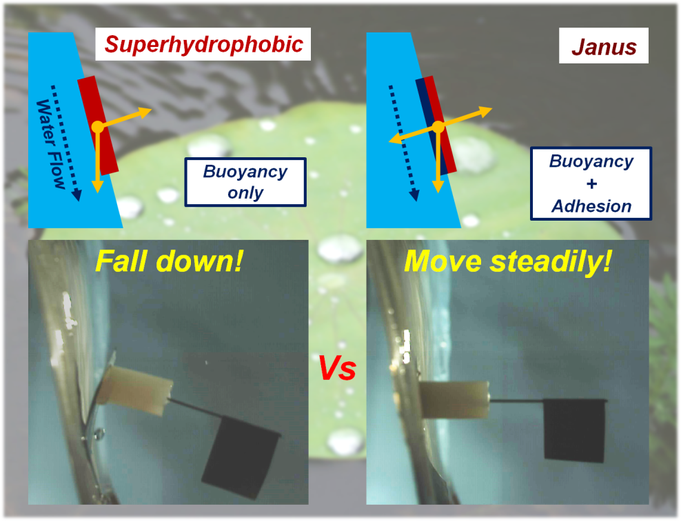 荷叶自清洁功能的原理早已为人所熟知,然而上表面超疏水下表面超亲水的荷叶的超浸润组合体系对荷叶本身的作用却少有人提及。江雷院士课题组发现荷叶的超浸润组合体系对荷叶在水面的稳定漂浮性具有重要作用,并以此为启发,制备出同样具有超浸润组合体系的铜片。超浸润组合体系使得密度远大于水的铜片能够漂浮在水面的同时,还能够被牢牢地固定在水气界面上。在水面摇动、强风吹拂以及在类似于瀑布的垂直水气界面等环境下,铜片依然能够保持很好的稳定性。相关链接为http://onlinelibrary.wiley.com/doi/10.1002/adfm.201701466/full