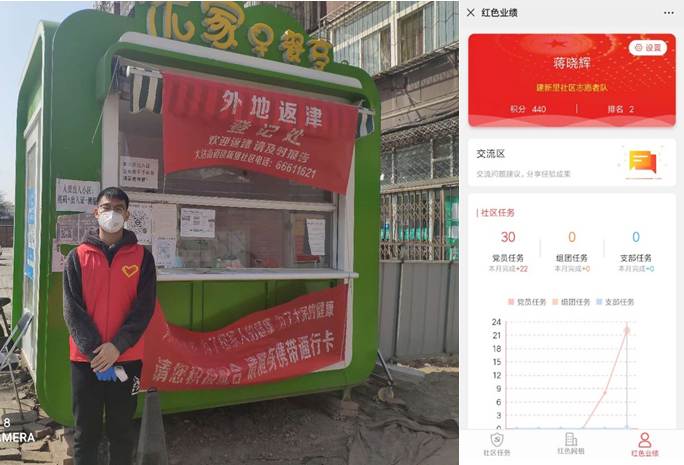 作为社区志愿者,蒋晓辉同学每天在小区门口为每一位进出小区的居民测量体温,检查居民出入证,登记外来车牌等,积极做好“外防输入,内防反弹”的后勤工作,将“生命安全重于泰山,疫情就是命令,防控就是责任”牢记于心。虽然还没有成为正式党员,但是他以党员标准要求自己,积极服务身边的人,让党旗和国旗飘扬在心中。