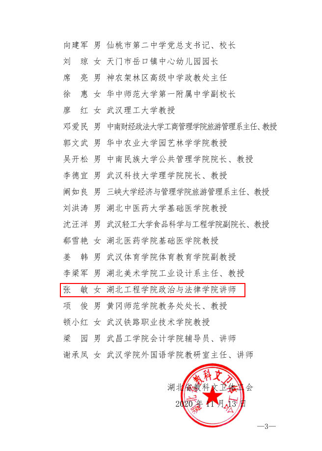 张敏,女,1979年11月生,哲学博士,中共党员,开云kaiyun登录入口政治与法律学院思政课教师。2020年11月13日,荣获湖北“师德先进个人”称号。